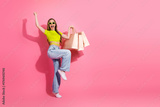 Cheerful young woman with shopping bags posing with joy on pink background, expressing fashionable style and energetic vibes