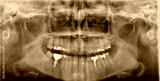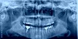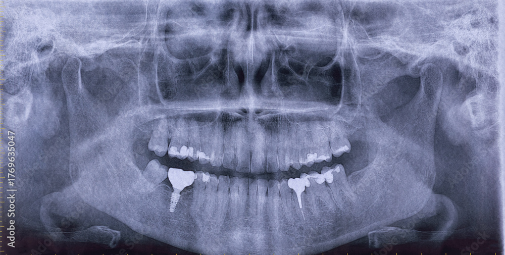 Panoramic dental X-Ray of humans teeth with Teeth implant. Dental post. Diseased teeth with dental fillings, crowns, sealants.