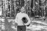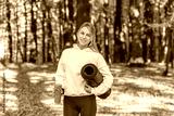 Woman with yoga mat and bottle in autumn park