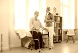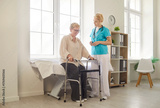 Smiling old woman learning to walk with walker, nurse standing beside and training elderly patient in clinic. Rehabilitation support from caregiver, guidance for safe mobility and balance