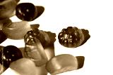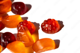 Translucent red and orange fruit gummy vitamins on white with shadows; selective focus, vitamins, kids healthy snack, healthy food, bright colors for healthy life nutrition concept.