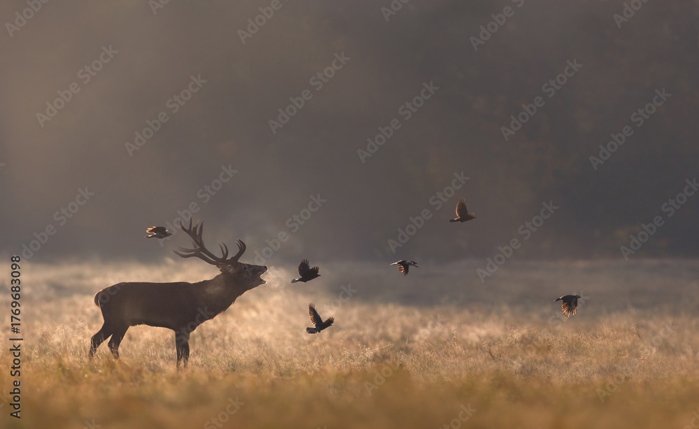 Silhouette of red deer stag roaring in misty field at golden sunrise