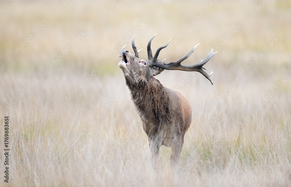 Portrait of a red deer stag roaring during rutting season in autumn