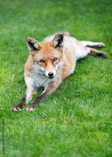 Portrait of a cute red fox lying calmly on a green grass