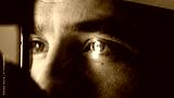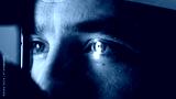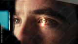 Close-up of a male patient undergoing a vision examination with an ophthalmic device, showcasing detailed eye structure and examination process in a clinical setting