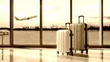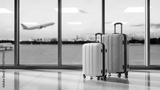 Pair of Suitcases in Airport terminal window with airplane takeoff. Travel? journey, vacation concept