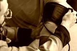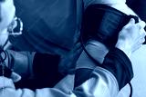 Caucasian young male paramedic wearing glasses measuring blood pressure of Black middle aged woman patient using digital monitor, focusing on arm and medical procedure in indoor setting