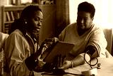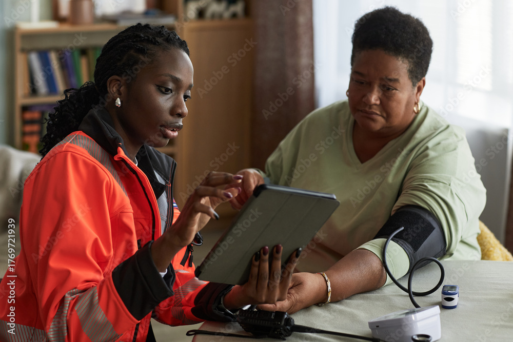 Black young adult woman, wearing medical uniform, showing digital tablet to middle aged Black female patient, sitting at table with blood pressure cuff on arm during health check