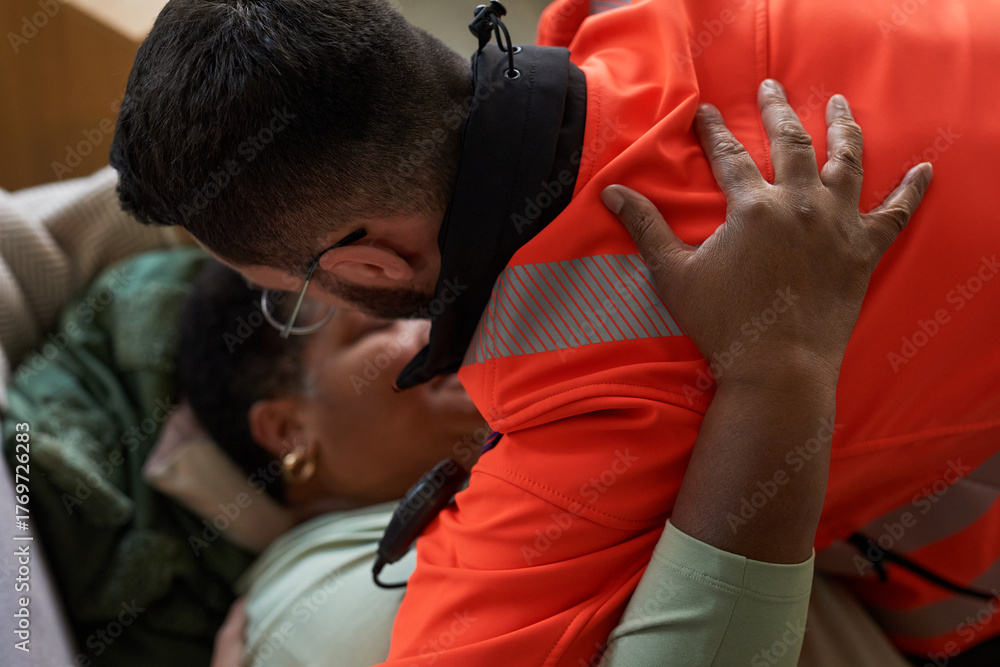 Middle aged Black woman lying on couch being assisted by young adult Caucasian male paramedic wearing uniform, paramedic leaning over providing emergency medical care