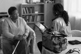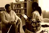 Black female paramedic showing digital tablet to senior woman with disability with cane during home visit, red medical bag and stethoscope on table in foreground, bookshelf in background
