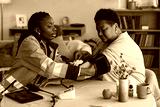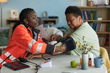 Black female healthcare worker measuring blood pressure of middle aged Black woman, using digital monitor, both sitting at table in home setting, medical equipment visible on table