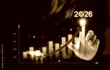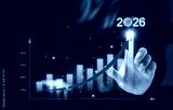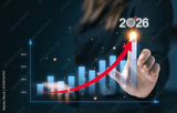 Businesswoman pointing at rising bar chart with red arrow and glowing 2026 target. Concept of growth, success, data analytics, and future business strategy.