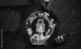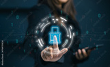 Businesswoman pressing digital padlock icon on virtual interface. Concept of cybersecurity, privacy protection, data encryption, and secure online technology.