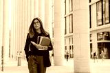 With a phone and files in hand, a woman strides purposefully among monumental columns, embodying modern ambition in a historic setting.