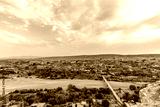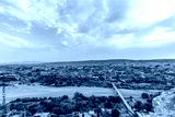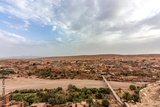Wide view over the desert town of Aït-Ben-Haddou in southern Morocco, showing traditional clay buildings, palm trees, and the arid landscape of the Atlas Mountains region under a cloudy sky.