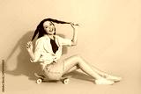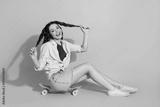 Cheerful young woman with braided hair sitting on a pink skateboard against a vibrant pink background, smiling joyfully