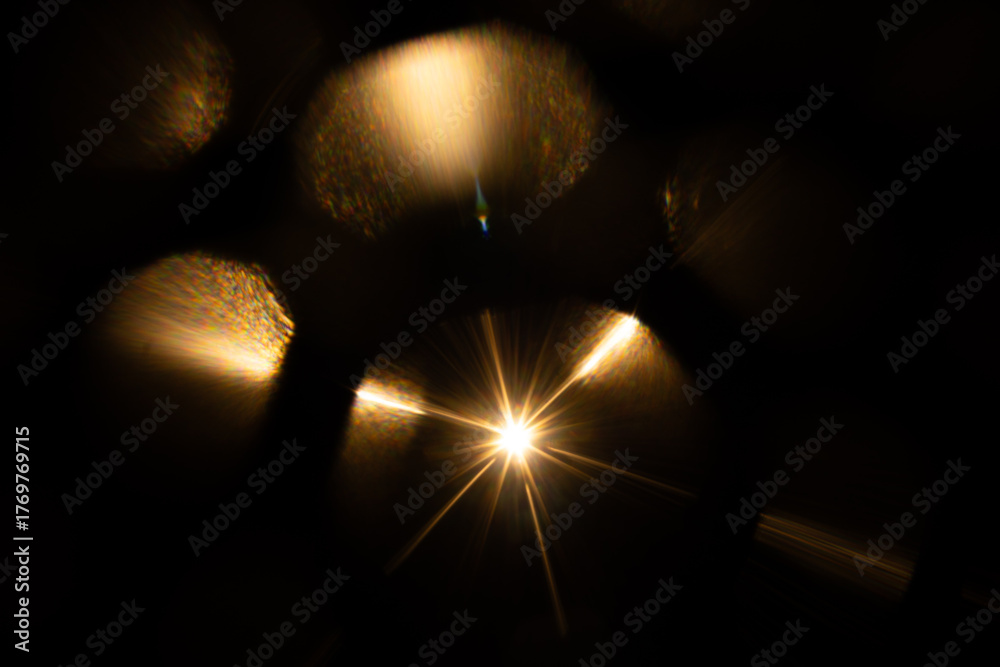 Lens Flare. Light over black background. Easy to add overlay or screen filter over photos. Abstract sun burst with digital lens flare background. Gleams rounded and hexagonal shapes, rainbow halo.