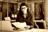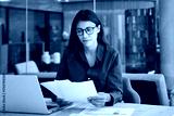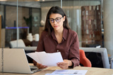 Focused latin hispanic business woman working on laptop computer reading financial document trader report in office. Thinking accountant entrepreneur manager businesswoman doing paperwork using pc