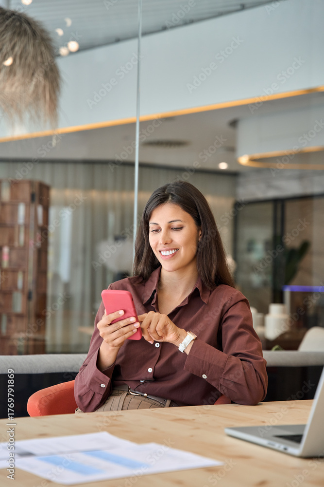 Young Indian business woman manager ceo using cell phone mobile app laptop. Smiling Latin Hispanic girl female businesswoman holding smartphone in office trading, reading, working online. Vertical