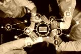 A dynamic representation of teamwork in digital advertising, showcasing hands coming together to symbolize collaboration, unity, and innovative marketing strategies through technology. Amity