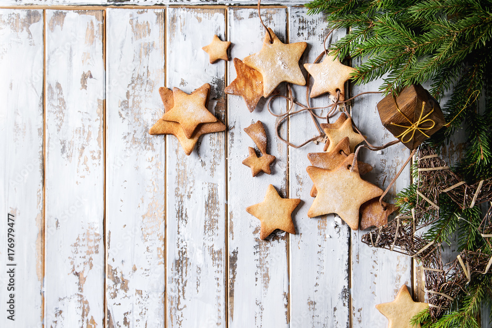 Garland of homemade shortbread star shape sugar cookies different size on thread with sugar powder, toys, fir branch over white wooden plank surface. Christmas treat background. Top view with space