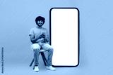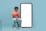A cheerful young man with curly hair sits on a chair, smiling while using his cell phone. He is happy to explore a new mobile app next to a big smartphone with an empty screen.