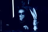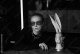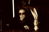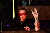 woman examines rabbit sculpture carefully, female investigator scrutinizes rabbit figure in dim