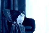 A tricolor cat sits tall on a cushioned chair, facing the light filtering through white curtains. A blue blanket rests beside.