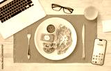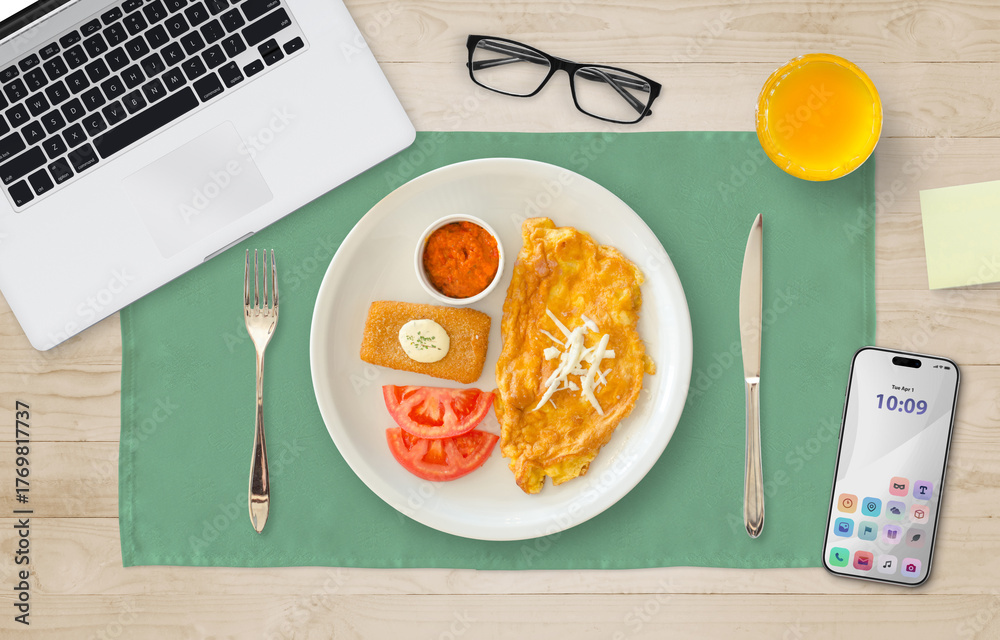 Laptop and breakfast setup with omelette, coffee and juice, representing remote work, productivity and balanced business morning routine