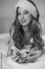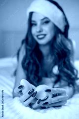 Caucasian woman in Santa Claus costume lying on bed holding curved sex toy.