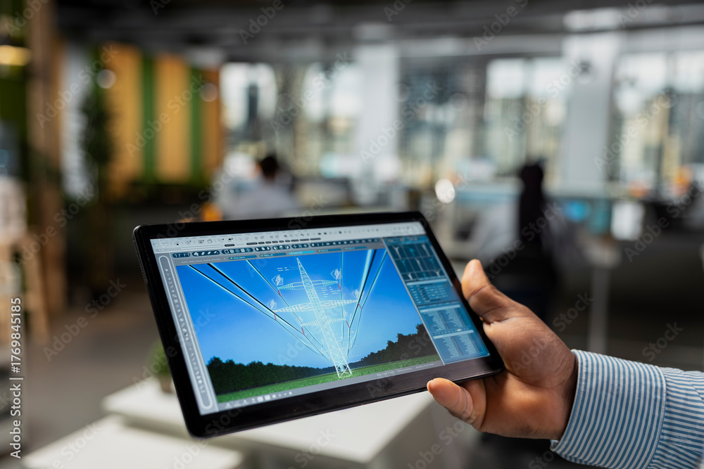 Close up of engineer using tablet to refine transmission tower systems, improving renewable energy integration. RD expert uses touchscreen device in office to design eco power lines infrastructure