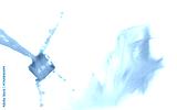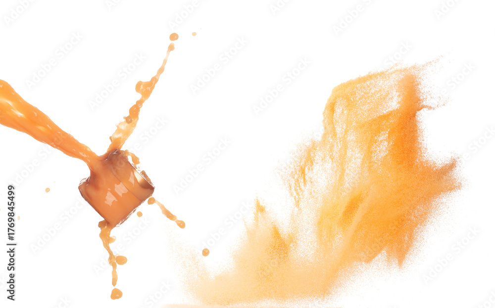 Orange Juice moisturizer lotion cream pouring down in cosmetic bottle container. Orange paint beauty lotion fluttering explosion in air, splash spill like explosion droplet. White background isolated