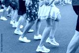 People dancing traditional Bulgarian horo on street, moving rhythmically in line with lively steps, bright summer clothes. Concept of horo dance, tradition, culture, community celebration, folk dance