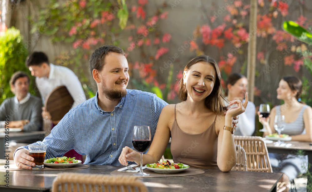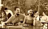 Portrait of loving couple with glasses of wine at a table in an open-air restaurant