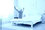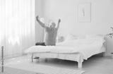 Elderly man is seen stretching comfortably in sunlit, minimalist bedroom after good nights sleep. Man sits on edge of neatly made bed, raising his arms above his head, showing sense of cheerfulness.