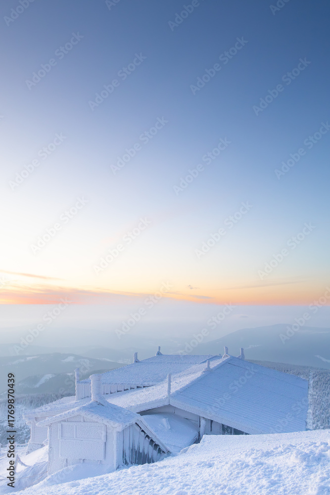 Snow-covered mountain lodge with panoramic views of the winter landscape, showcasing a serene sunset sky and distant hills, creating a tranquil atmosphere for relaxation vertical