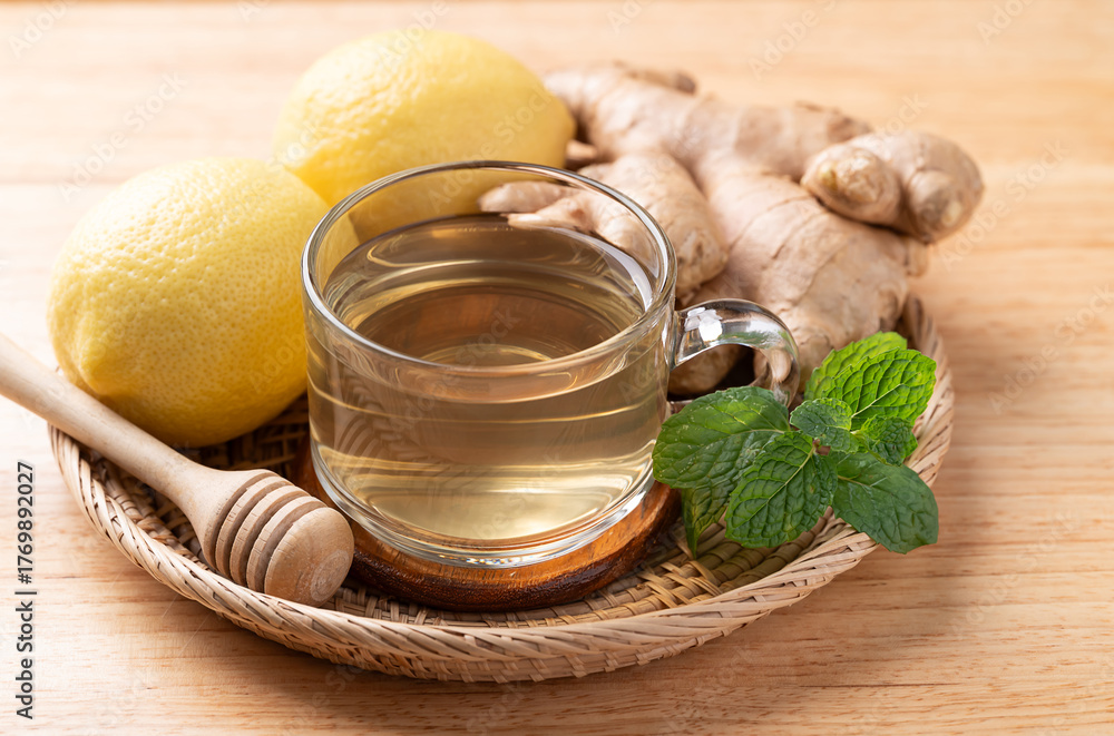 Lemon and ginger tea in cup glass on wooden background, Healthy hot drink