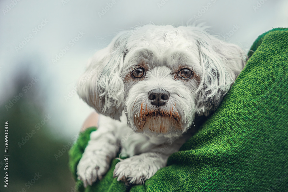 A small white Maltese dog with gentle eyes rests comfortably in the arms of a person wearing a green sweater