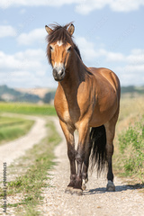 Buckskin Icelandic horse stands on rural path in summer countryside