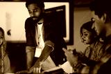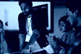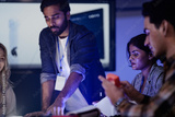 An Indian engineer presents an AI powered prosthetic arm in an RD lab. Her team, including a Caucasian woman, analyzes the robotic prototype and its data on a screen.