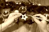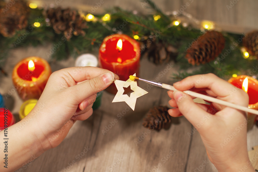 Children's hands paint yellow color wooden toy star with spruce branches, pinecones and candles on table