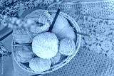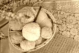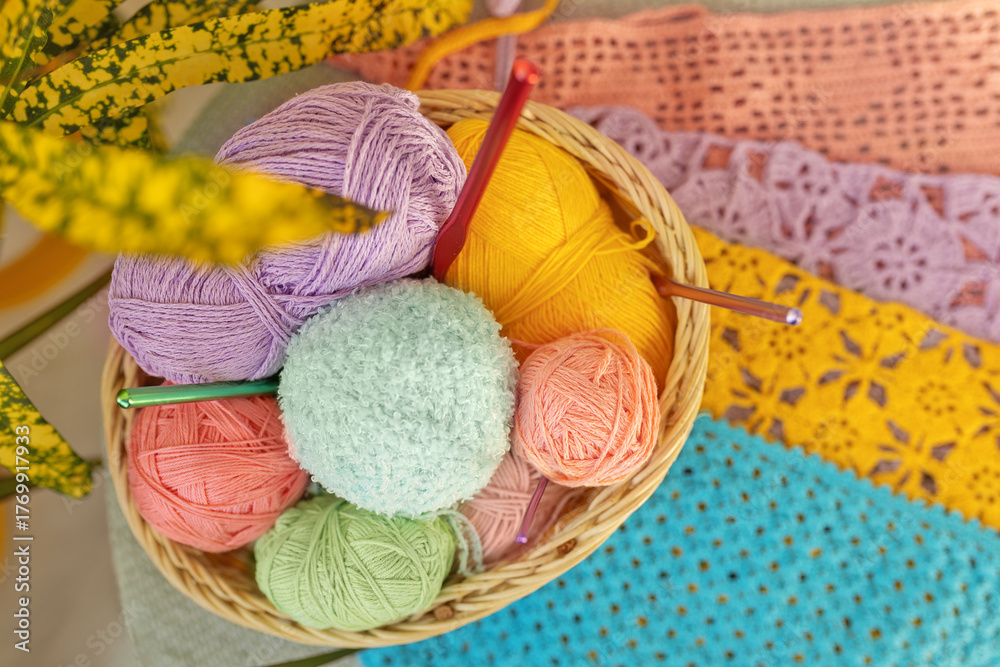 Basket of colorful yarn and crochet hooks