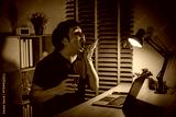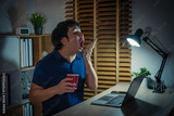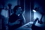 sleepy man yawning while working with laptop at night