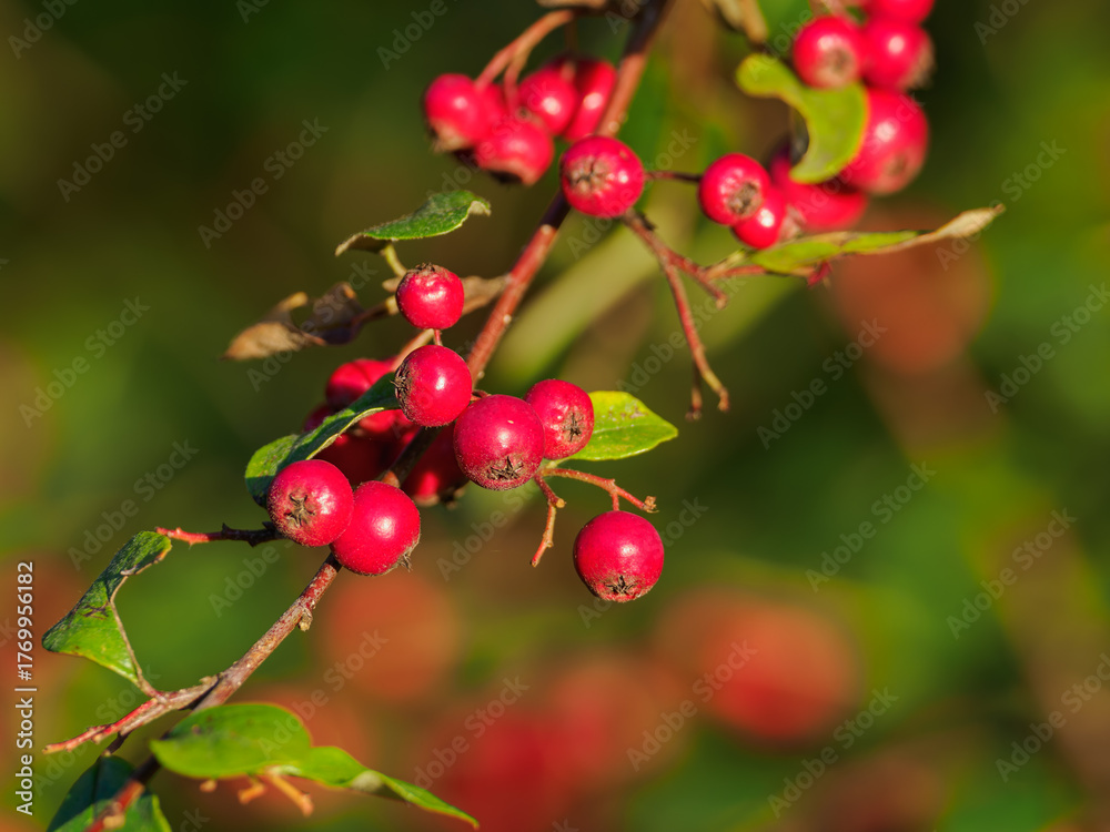 Small red apples on a twig with green leaves.