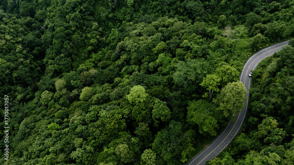 Road rainforest ecosystem and healthy environment concept , Road in the middle of the forest Concept of using electric cars to protect the environment and transportation