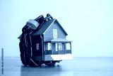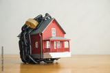 House in chain with padlock on wooden table white wall background copy space. Asset forfeiture, foreclosure, bankruptcy, burden from mortgage loan, financial problem, home protection concept.