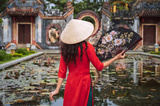 Young woman in red dress in front of Buddhist temple during Spring Festival, view from back