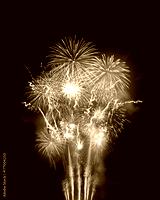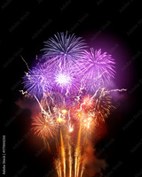 A large bright fireworks display event with golden orange and purple rocket breaks.