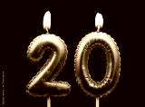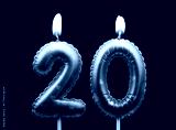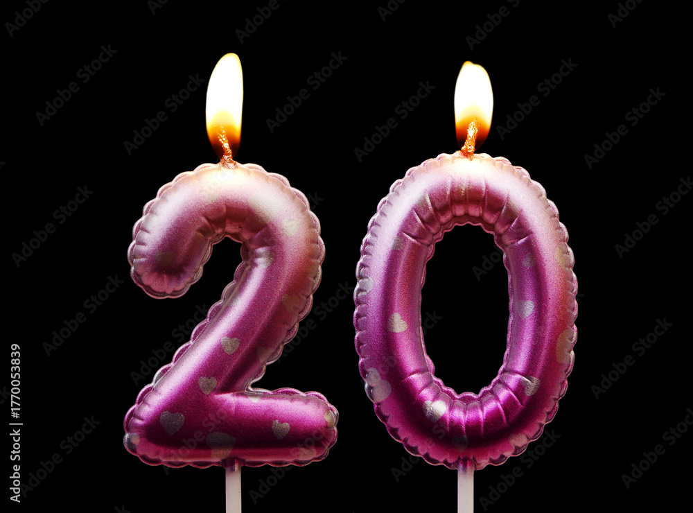 Pink air balloon shaped birthday candles burning on black background, number 20