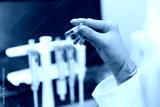 Female scientist in lab coat studying blue liquid in test tube used for DNA analysis and biochemical research.